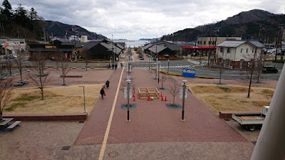 2023年1月中旬、三陸1泊2日旅行の4回目。JR石巻線の終点、女川駅から女川港方面を望む。この一帯は東日本大震災で全滅した。女川は高い防潮堤を建設せず、代わりに町全体をかさ上げする方針で復興を進めた。