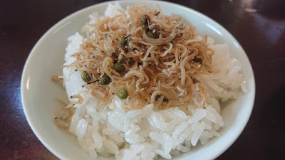 本日の朝食。写真ではちりめん山椒を最初から多めにのせているが、実際はちりめん山椒を少しずつご飯にのせながら食べ進んだほうがおいしい。ご飯は山形県産の『雪若丸』。